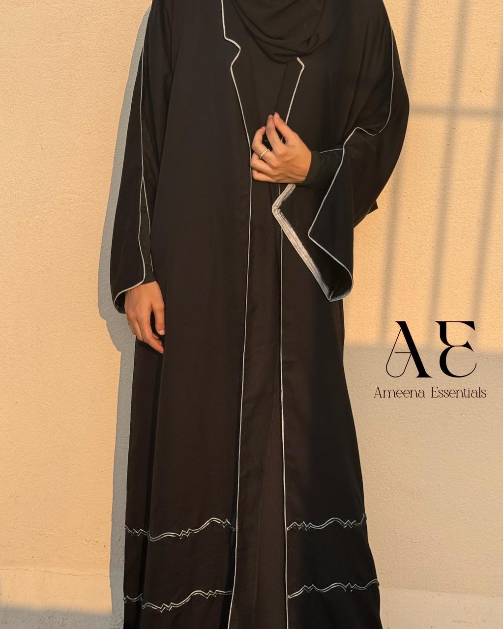 A timeless black abaya crafted with stunning design details that elevate its overall elegance. Featuring a beautifully enhanced pattern, this piece offers a graceful flow and a refined look, perfect for both special occasions and everyday sophistication.