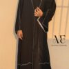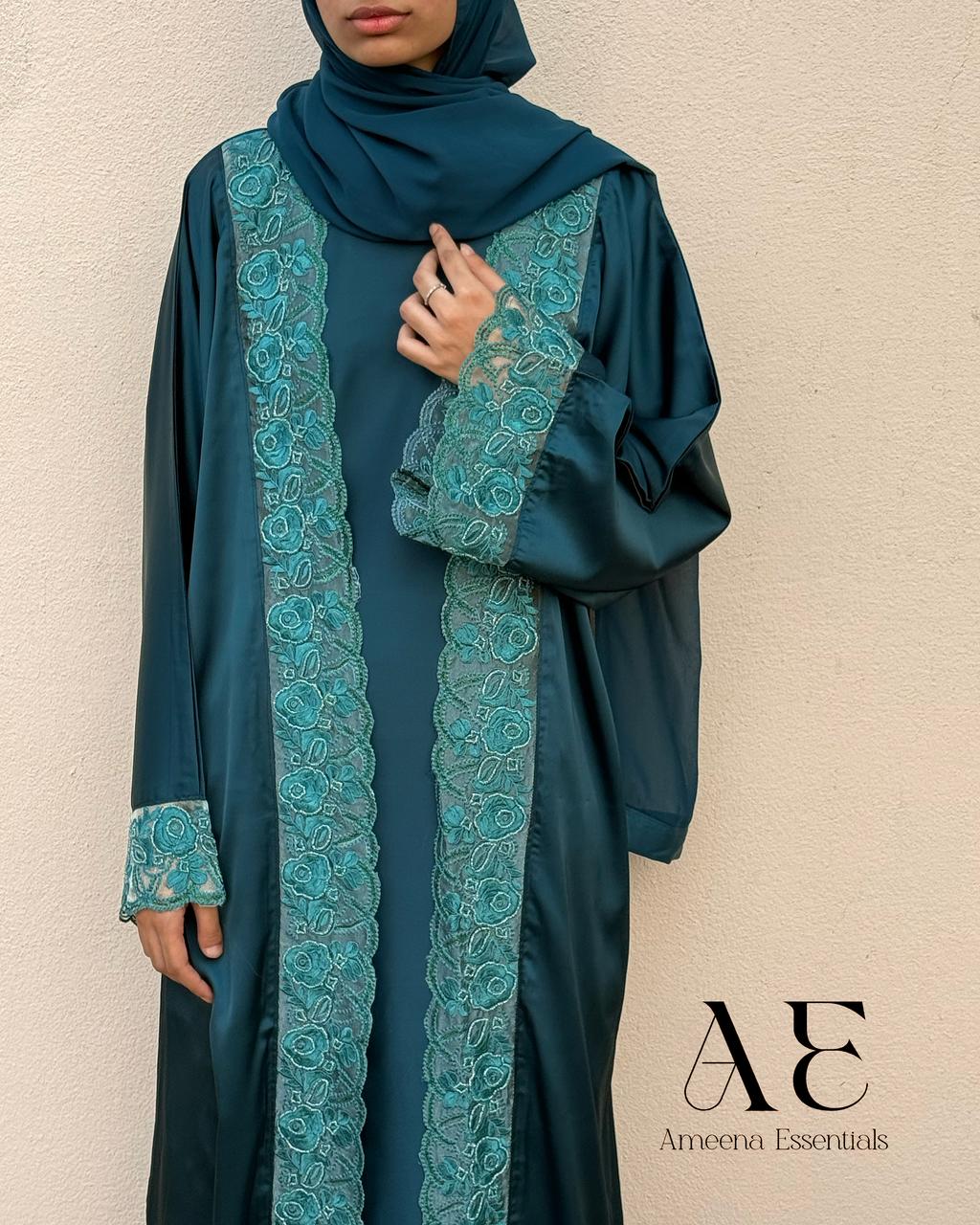 Gracefully designed in a rich green shade, this elegant abaya features delicate lace detailing that adds a touch of sophistication. The flowy silhouette offers both comfort and style, making it perfect for everyday wear as well as special occasions.