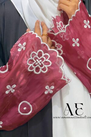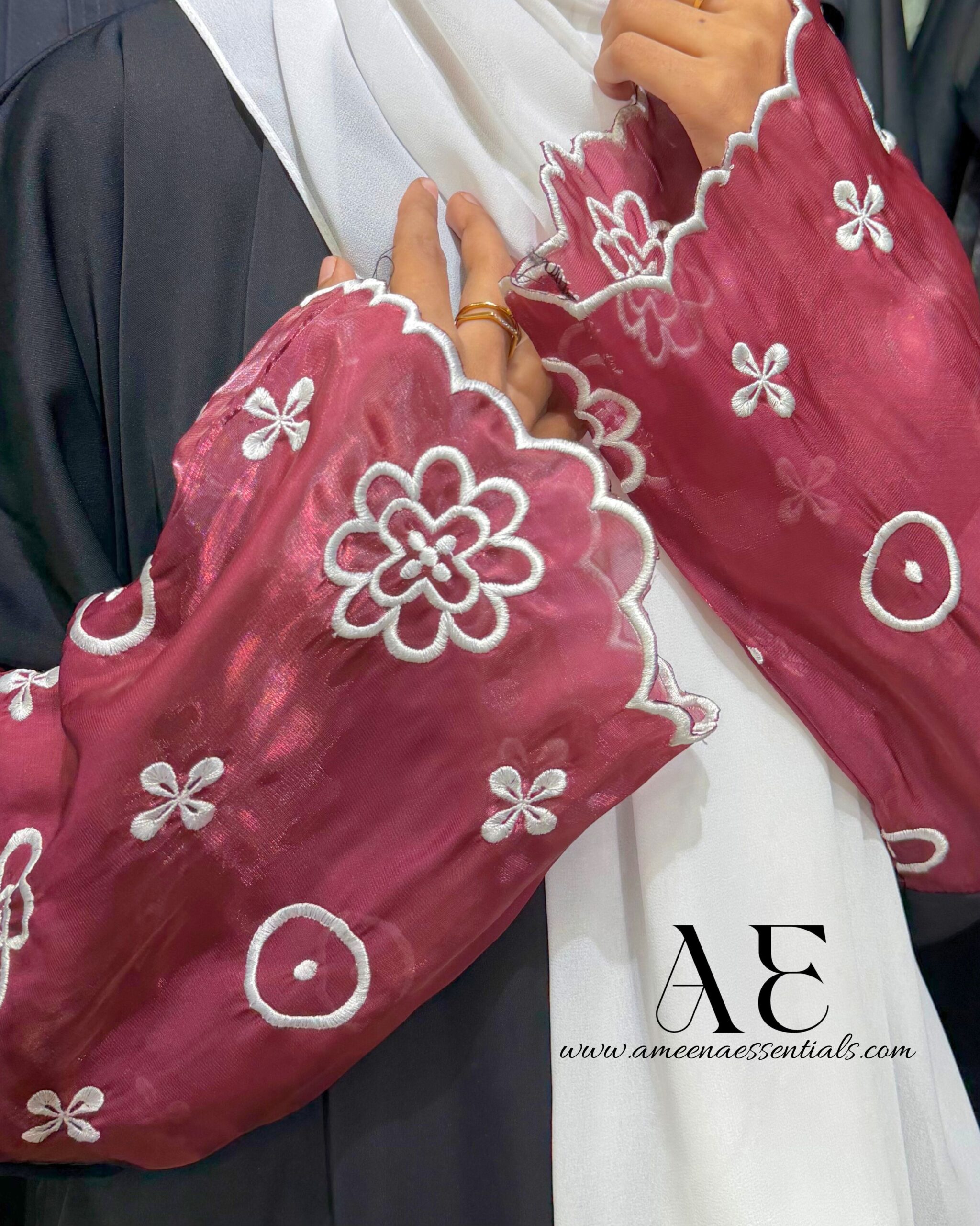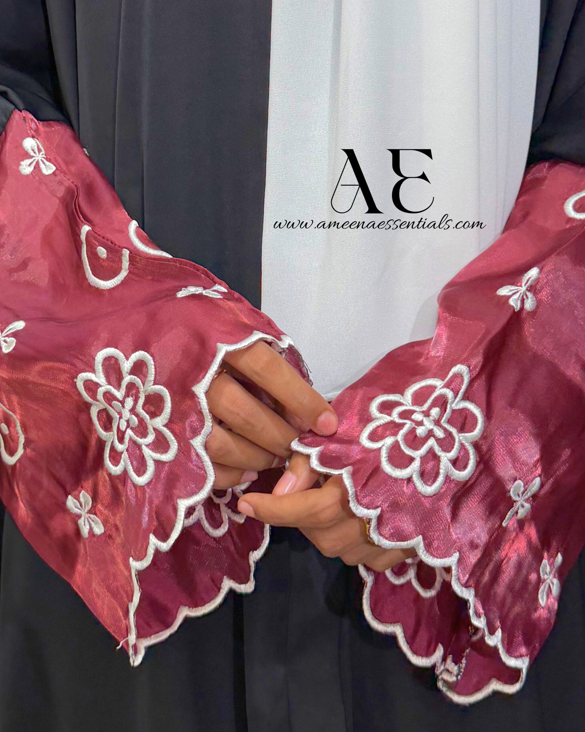 Crafted with elegance and comfort in mind, the Bloom Organza Abaya is made from premium Korean Nida fabric, offering a graceful fall and luxurious feel. The sleeves feature delicate organza embroidery, adding a soft floral charm for a timeless finish.