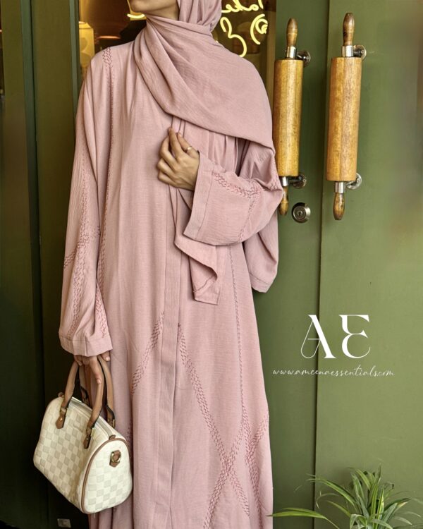 The Muse Collection is crafted in premium Cey fabric, known for its soft flow and elegant drape. Each abaya is paired with a matching chiffon dupatta in the same shade, giving you a complete and graceful look.