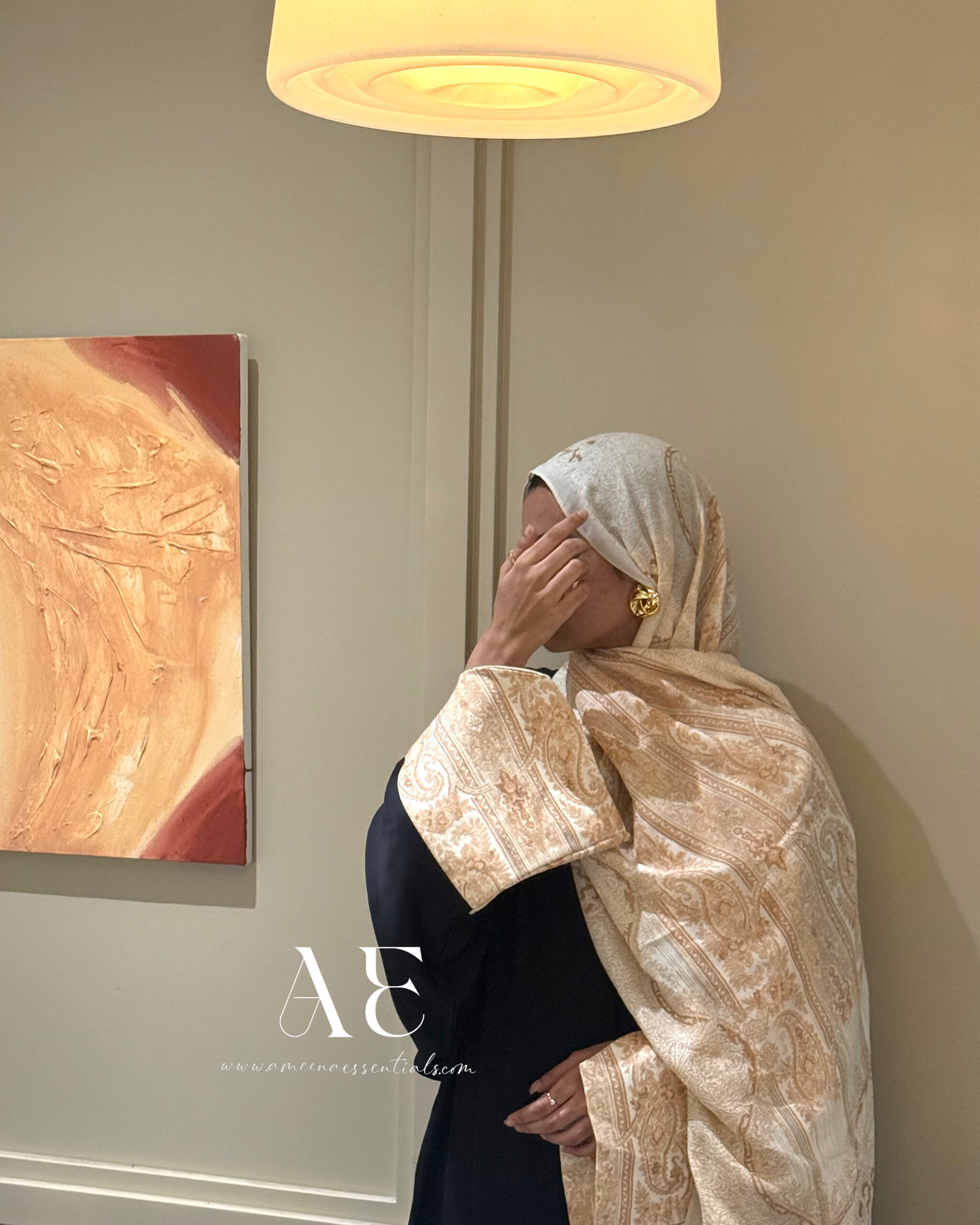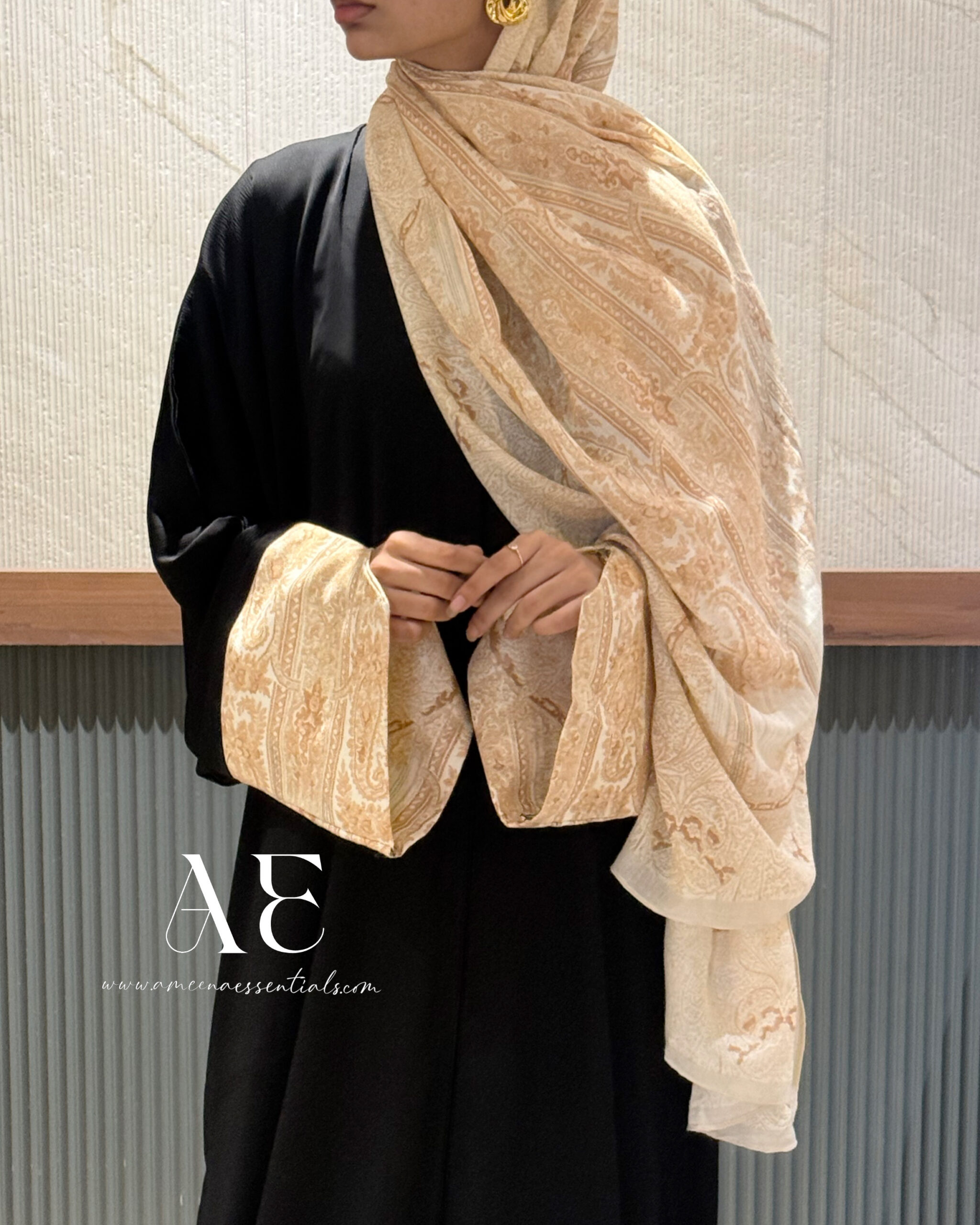 The Royal Pashmina Set 🍁a blend of luxury and grace, it’s an open button abaya crafted in premium TikTok silk with intricate pashmina details on sleeves paired with an elegant pashmina dupatta